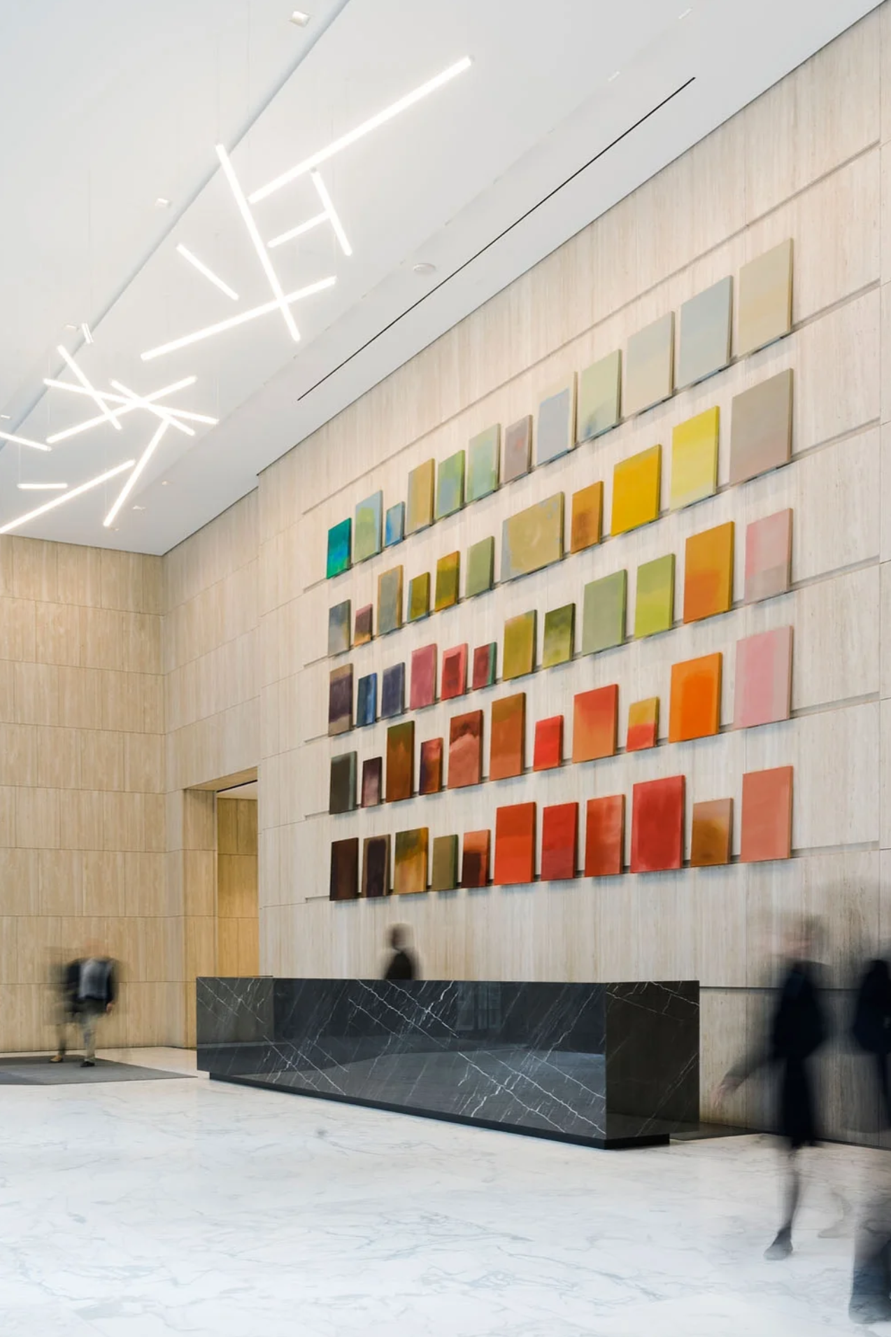 Adding a youthful touch, the lobby acts as a gallery for Doyle Partners artwork, ‘Color Library.’ The piece displays tiers of rectangular and square blocks in varying shades of brown, red, orange and green.