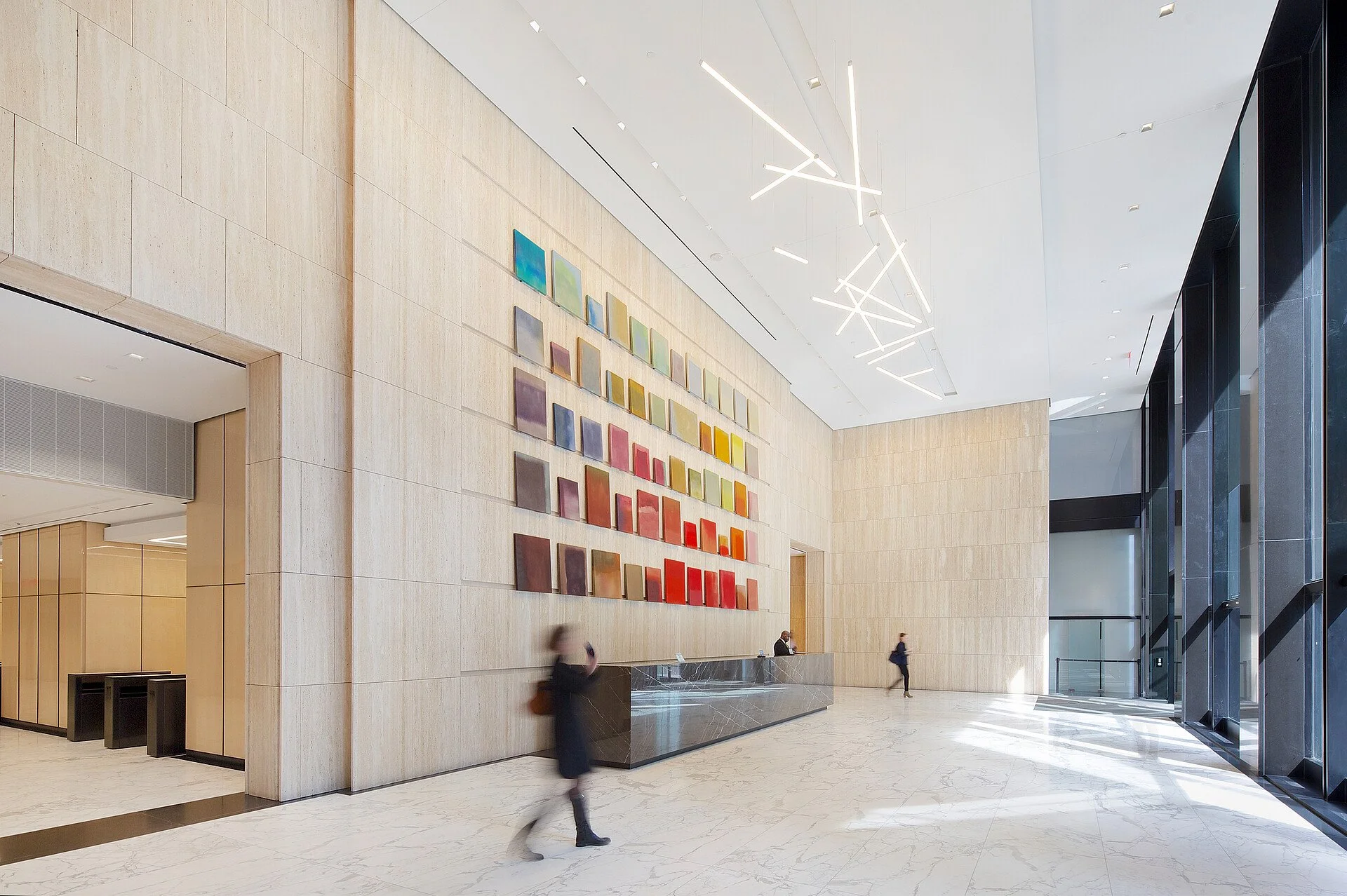 The project involved the renovation and modernization of 90 Park Avenue’s lobby and entry, creating a dynamic space evocative of the energy in the surrounding neighborhoods. The elevated ceilings and marble walls of the lobby work in conjunction with the glass entry to lend a sense of depth and brightness to the space.