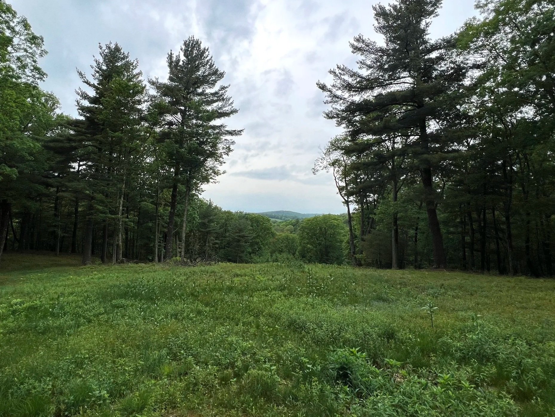 Framed views towards dense forests, rolling hills, and the Catskill Mountains beyond