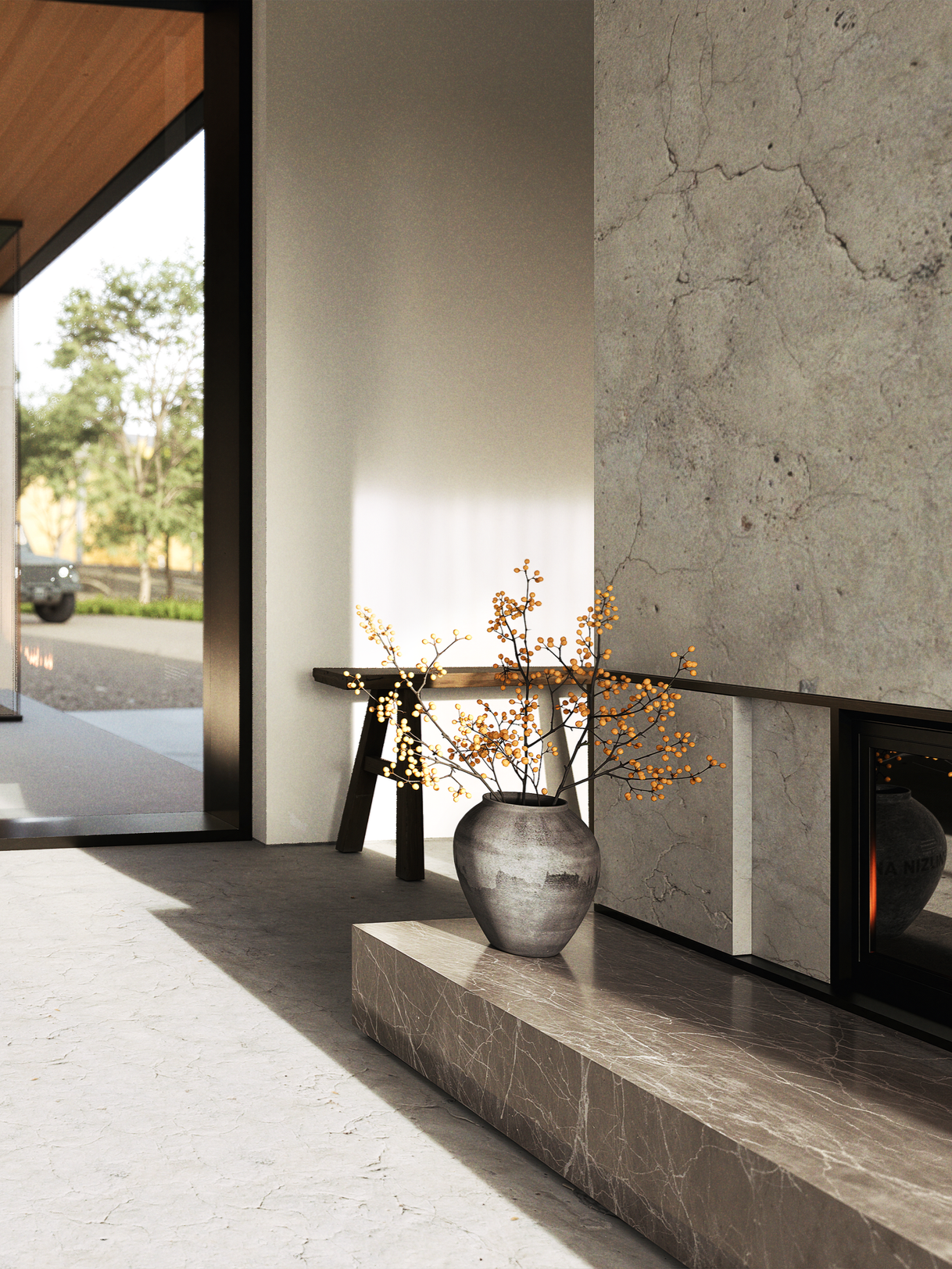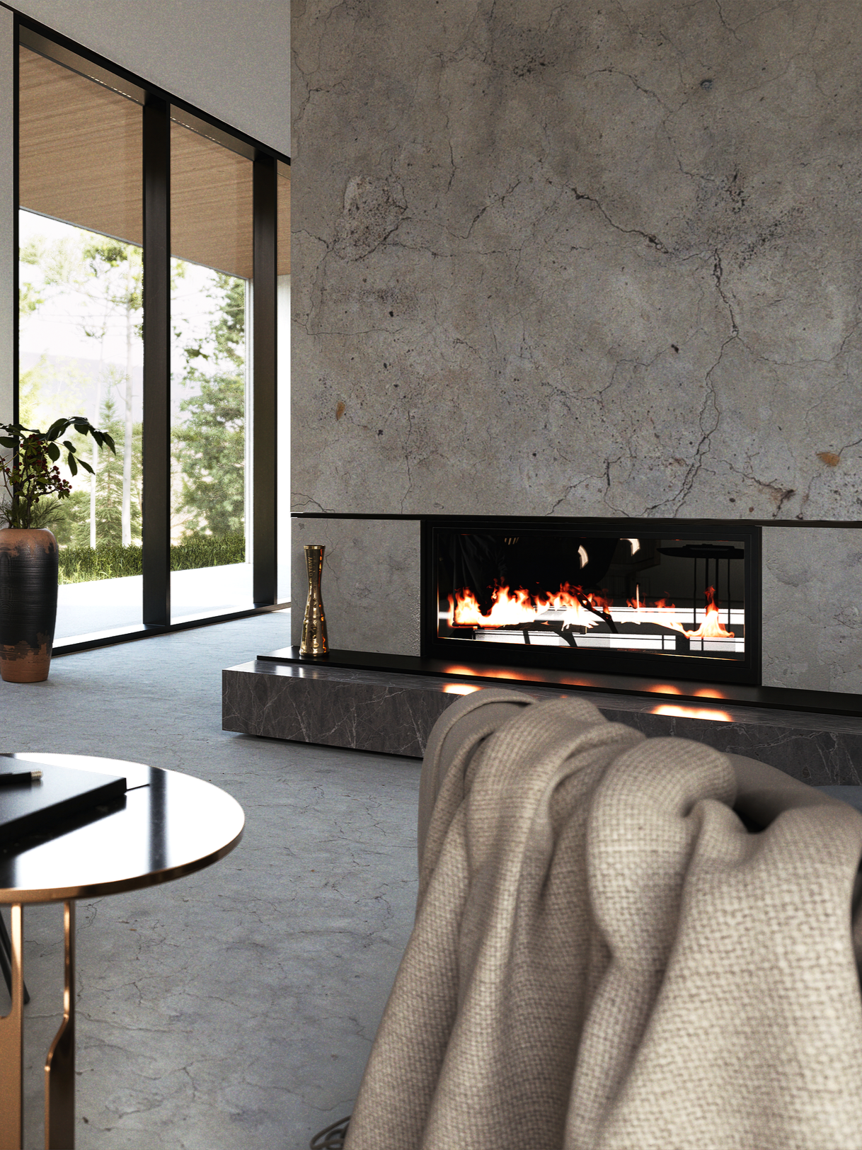 The open-concept interior revolves around a central, double-sided fireplace. Positioned between the living and dining areas, the textured hearth delivers a strong sense of tactile separation, demarcating each zone with a material boundary, while providing a captivating, relaxing focal point that weaves both spaces.