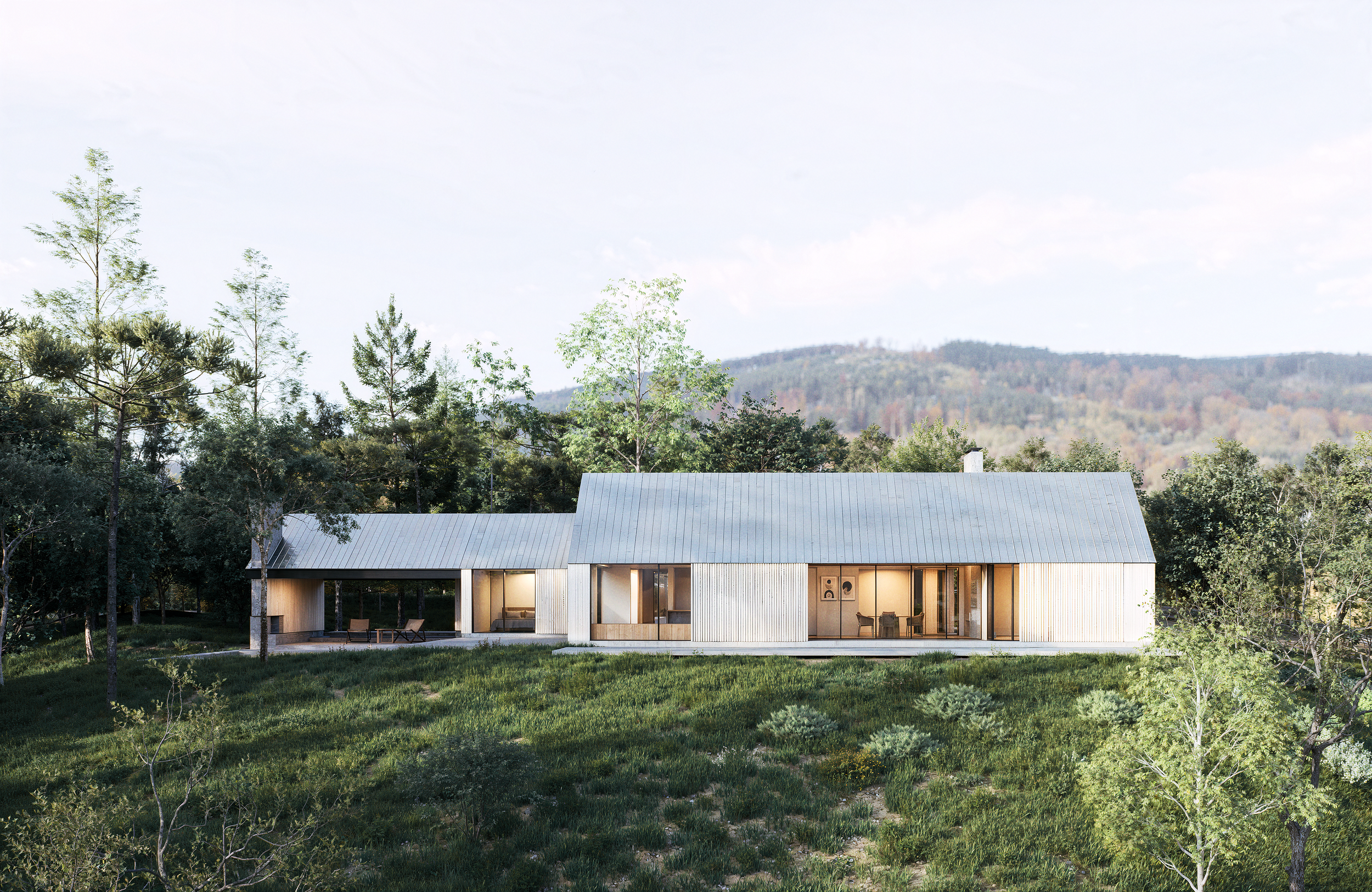 Perched on 35 acres in the hills overlooking the Catskill Mountains, this contemporary family home is grouped as three interconnected volumes defined by a triad of sloped, metal roof structures.